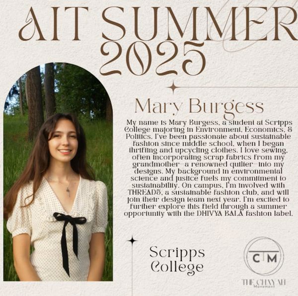 With a strong foundation in environmental science and justice, Mary is passionate about creating fashion that’s both ethical and expressive. On campus, she’s active in THREAD5, a sustainable fashion club, and will be joining their design team next year.